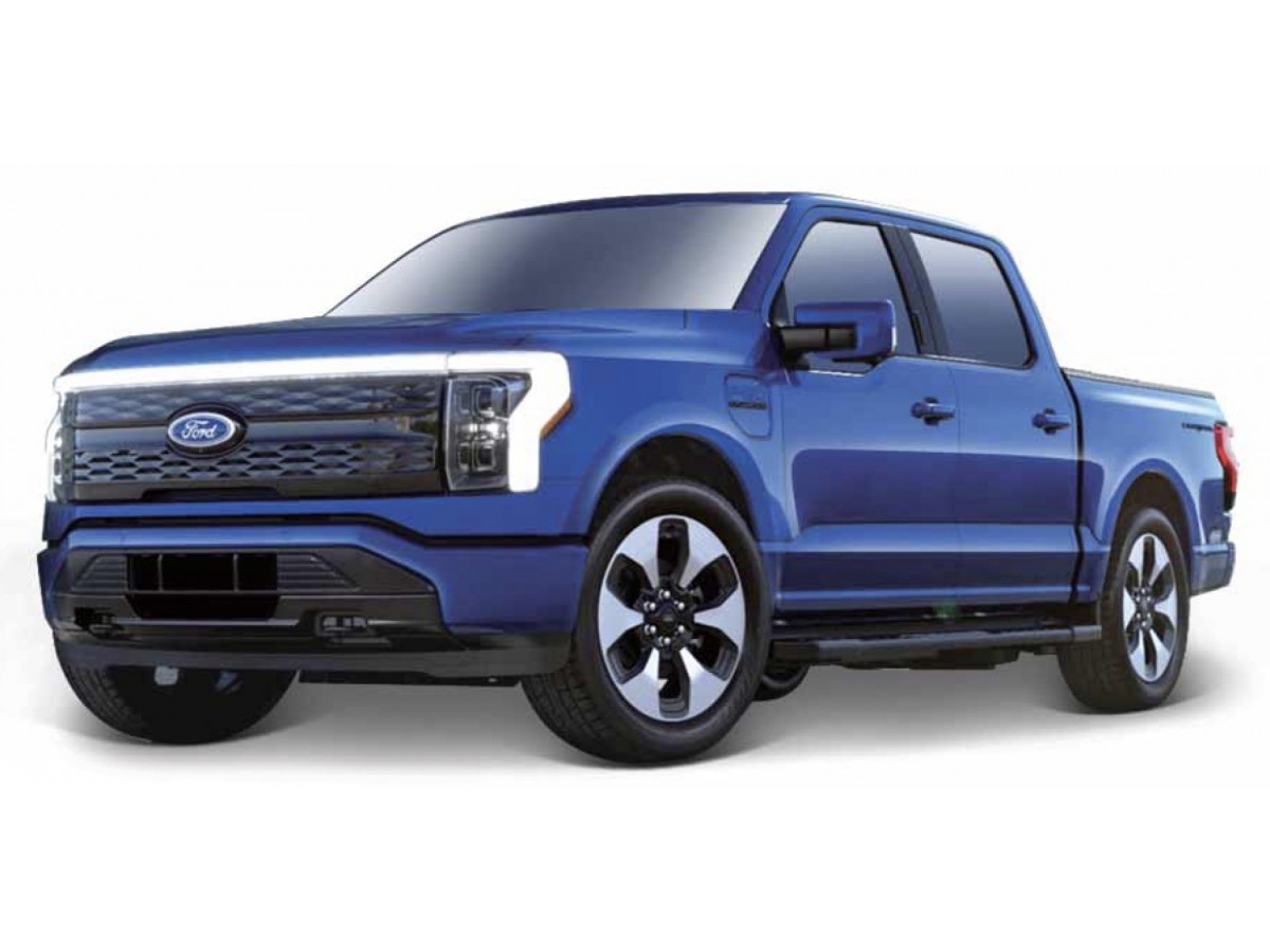 Gedetailleerd schaalmodel van de Ford F-150 Lightning 2022 in schaal 1:43 en kleur blauw.