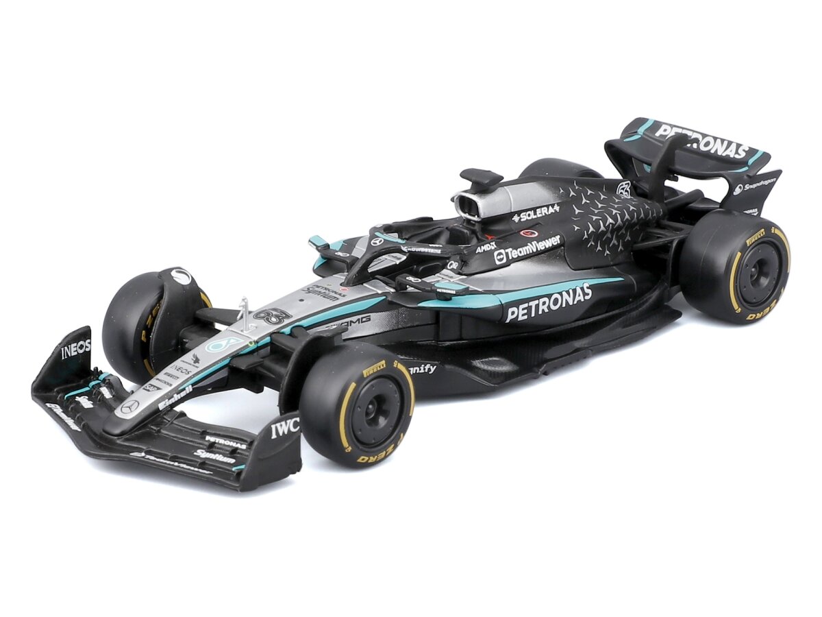 Gedetailleerd schaalmodel van de Mercedes Benz AMG W16 #63 George Russell 2025 in schaal 1:43 en kleur Zilver/zwart/turquoise.