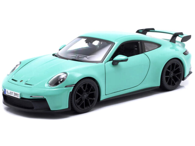 Gedetailleerd schaalmodel van de Porsche 911 Gt3 2021 in schaal 1:24 en kleur turquoise.