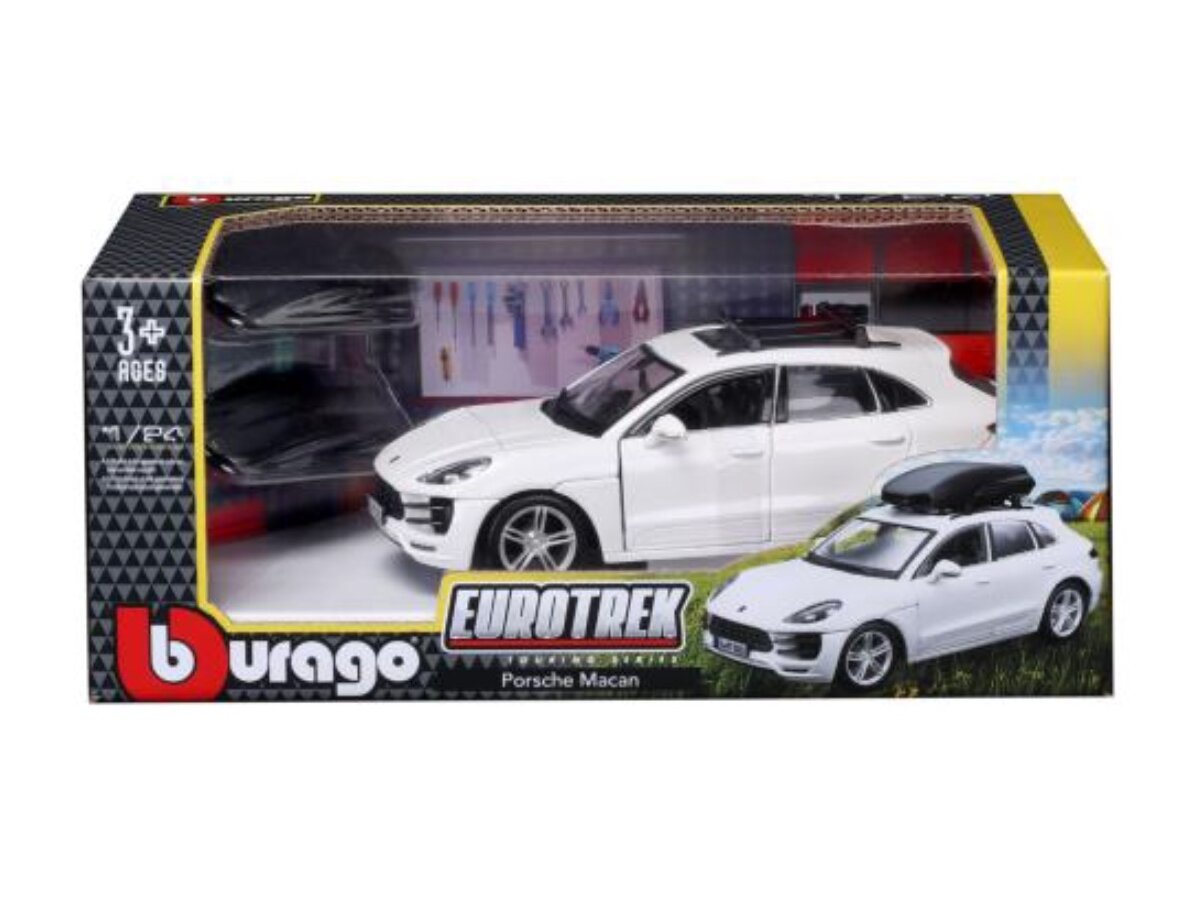 Gedetailleerd schaalmodel van de Porsche Macan + Cargo Box in schaal 1:24 en kleur wit.